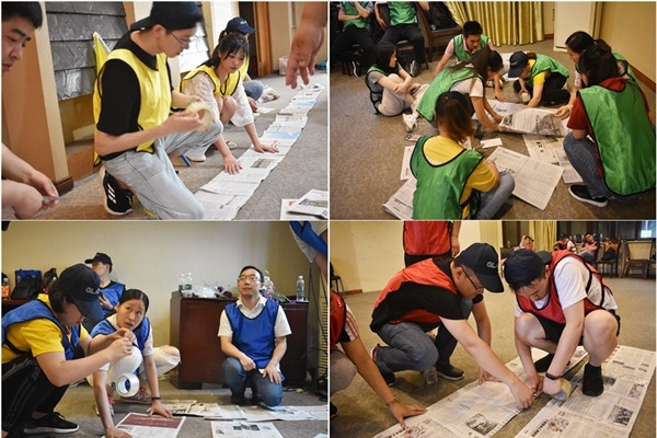 報紙成為了“履帶”,成員們利用膠帶,將“履帶成形”,在接下來的行進中可不能斷了,“盡可能牢固?。 ?