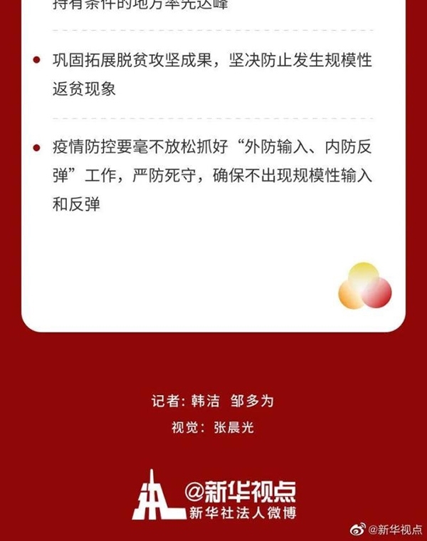 會議強(qiáng)調(diào),明年是我國現(xiàn)代化建設(shè)進(jìn)程中具有特殊重要性的一年。做好明年經(jīng)濟(jì)工作,要以習(xí)近平新時代中國特色社會主義思想為指導(dǎo),全面貫徹黨的十九大和十九屆二中、三中、四中、五中全會精神,堅持穩(wěn)中求進(jìn)工作總基調(diào),立足新發(fā)展階段,貫徹新發(fā)展理念,構(gòu)建新發(fā)展格局,以推動高質(zhì)量發(fā)展為主題,以深化供給側(cè)結(jié)構(gòu)性改革為主線,以改革創(chuàng)新為根本動力,以滿足人民日益增長的美好生活需要為根本目的,堅持系統(tǒng)觀念,鞏固拓展疫情防控和經(jīng)濟(jì)社會發(fā)展成果,更好統(tǒng)籌發(fā)展和安全,扎實(shí)做好“六穩(wěn)”工作、全面落實(shí)“六?!比蝿?wù),科學(xué)精準(zhǔn)實(shí)施宏觀政策,努力保持經(jīng)濟(jì)運(yùn)行在合理區(qū)間,堅持?jǐn)U大內(nèi)需戰(zhàn)略,強(qiáng)化科技戰(zhàn)略支撐,擴(kuò)大高水平對外開放,確?!笆奈濉遍_好局,以優(yōu)異成績慶祝建黨100周年。