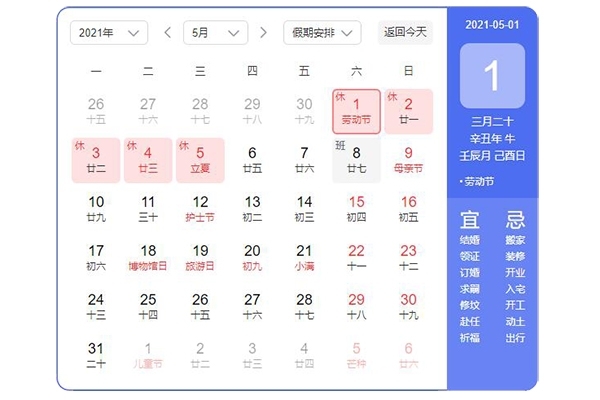 2021年5月1日-5月5日放假調休,共5天。5月8日(星期六)我們正常上班。節(jié)前各位同事安排好工作,配合行政做好清潔打掃工作,檢查好電源開關,關好門窗。節(jié)日期間,請大家注意人身安全和財產安全,愉快的度過假期。