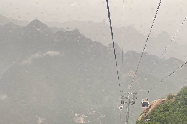 就這么走到北峰索道處,北峰索道8分鐘,較西峰短一些,隨著索道下山,山中的雨水在山體瀉下一道道水簾飛瀑,水流川急。