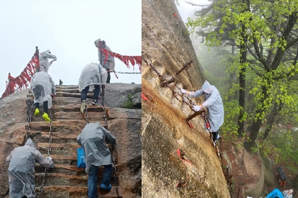 繼續(xù)上行到達(dá)華山青龍脊,紅色的飄帶與銅鎖在山中,隨著風(fēng)雨飄蕩,云霧似雪,紅色的飄帶寓意愛(ài)情永存,愛(ài)人永不變心。