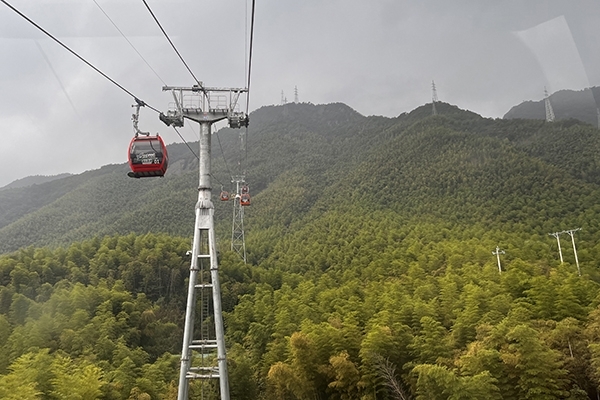 經過2個小時的車程,我們到達山腳下,但是又該怎么穿過群山,到達云端?答案就在下面,索道帶我們一步步接近秋空。這是一個2.3公里長的路程,43度至大傾角,落差有754米。坐在吊廂,一路領略那綠油蔥蔥。20分鐘的空中索道旅途,“↗→↘”,這就是我們經過的姿勢,由下而上、由仰到俯,過癮?。。。?!